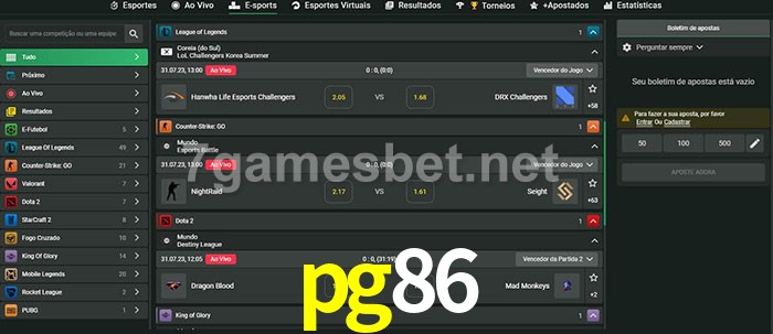 O pg86 oferece uma grande seleção de opções de apostas em e-sports com probabilidades competitivas